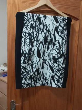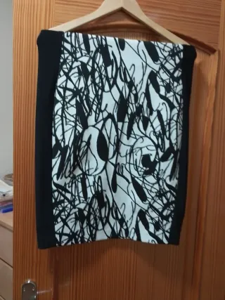 Falda elástica con un llamativo estampado abstracto en blanco y negro. Su diseño moderno la hace versátil para diferentes ocasiones. - Diseño de corte recto. - Tejido elástico para mayor comodidad. - Paneles laterales lisos en negro.