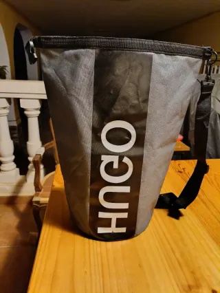 Es adecuada para transportar equipo deportivo, como pelotas o ropa de entrenamiento. Presenta un acabado en color gris con una franja negra vertical donde se lee el nombre de la marca en letras blancas. Fabricada con materiales resistentes e impermeables para proteger el contenido.