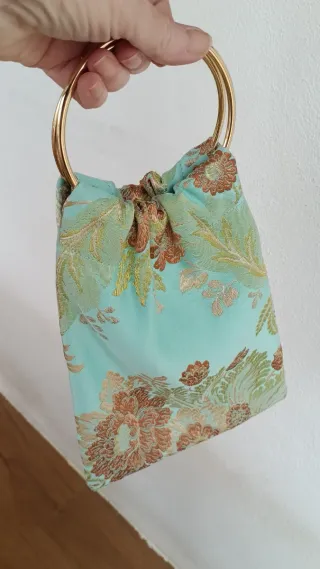 Bolso de tela con un bonito estampado floral y anillas doradas. - Diseño inspirado en la tela de fallera. - Asa con dos anillas metálicas doradas. - Cierre fruncido superior.