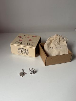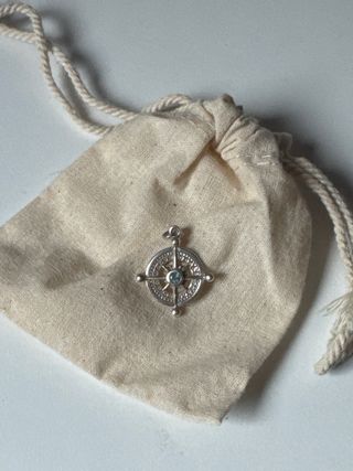 Conjunto de anillo y colgante con diseño de brújula. - Anillo plateado con topacio azul. - Colgante plateado a juego, también con topacio azul. - Incluye bolsa de tela SAN SARU. - Cajita original. (El color del anillo es un poco mas oscuro que el del colgante)