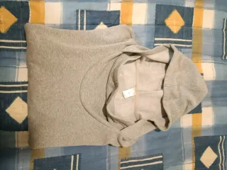 Sudadera con cuello y capucha color gris. Domyos. Talla XL. Le falta el cordón del cuello y un puño está rasgado (se ve en las fotos)
