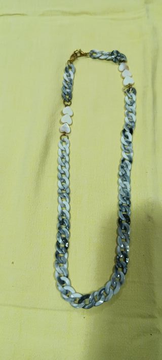 Elegante collar de bisutería con un diseño de eslabones en tonos grises y blancos. Los detalles en forma de corazón añaden un toque especial. - Diseño de eslabones. - Detalles en forma de corazón.