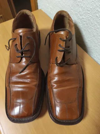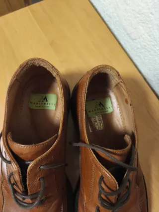 Zapatos Martinelli Evolution T45 Espectaculares zapatos de piel en color tabaco/cuero. *Calidad: Fabricados integramente en piel de alta gama, con suela de cuero legítimo (Vero Cuoio). *Estado: Solo un par de usos. La suela y estructura están casi nuevas. La piel mantiene su brillo, aunque presenta las marcas lógicas de flexión y un pequeño roce superficial en la puntera derecha (ver fotos de detalle). *Diseño: Puntera cuadrada clásica (punta chata) y cordones originales *Extra: Con su caja original pequeños roces del paso del tiempo. Ideales para bodas,eventos o uso profesional. Precio original 118€. Calidad superior.