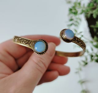 Pulsera tipo brazalete ajustable abierto de latón probablemente con fina capa de oro. Motivos florales de estilo y época victoriana. Cabujones de vidrio opalino en tono azulado. En muy buen estado, pátina irregular. Ver fotos. Medidas: Aproximadamente 6cm de diámetro con la abertura que se muestra en las fotos.