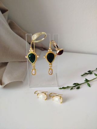 Lote de bisutería sin usar . Todo en tono dorado. Incluye dos anillos y dos pares de pendientes. En perfecto estado. Ver fotos. No se venden por separado . Anillos aprox talla 8