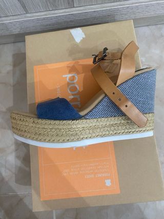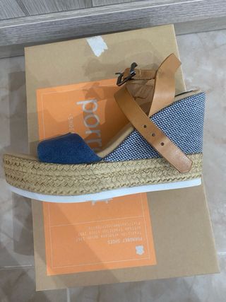 Preciosas sandalias de la marca Porronet, talla 36. Ideales para el verano. Son de color azul y marrón, con una cuña cómoda y un diseño elegante. - Material de alta calidad. - Diseño estilizado. - Muy cómodas.