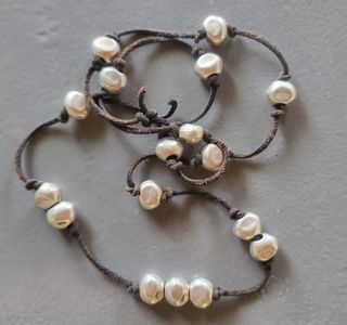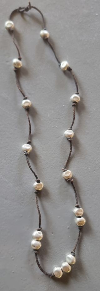 Preciosa gargantilla de cuero marrón con cuentas plateadas. Ideal para añadir un toque elegante a tu look. - Cuenta con aproximadamente 14 cuentas de metal. - Cordón de cuero marrón oscuro. - Diseño sencillo y sofisticado.