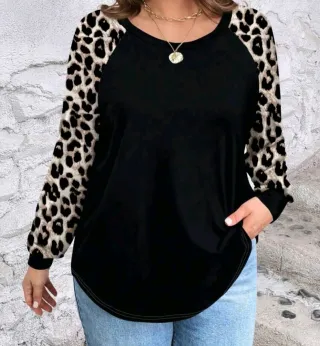 Preciosa camiseta de manga larga. La parte central es negra y las mangas tienen un estampado de leopardo en tonos marrones y beige. Es una prenda elegante y cómoda, ideal para cualquier ocasión. - Diseño original con estampado de leopardo. - Manga larga. - Tejido suave y agradable al tacto.