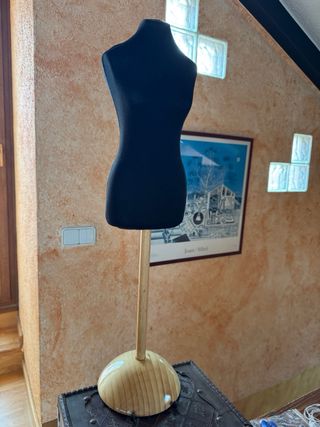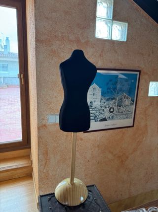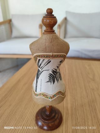 Mini maniquí de tela con base de madera. - Diseño elegante y funcional. - Base redonda de madera clara.