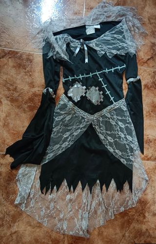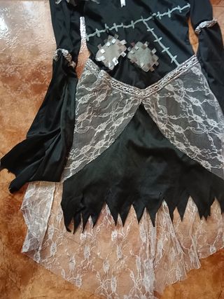 Disfraz de bruja con un diseño espeluznante y detalles de encaje. - Vestido negro con parches y costuras. - Mangas acampanadas con encaje. - Detalles de encaje en el cuello y la falda. - Falda con puntas irregulares.