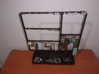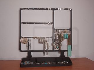 Organizador de joyas con múltiples niveles para colgar pendientes, collares y pulseras. - Diseño de sobremesa. - Bandeja inferior para accesorios pequeños. - Colores varios