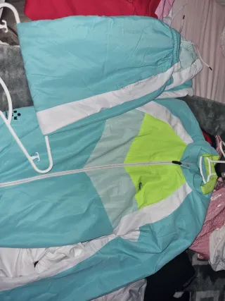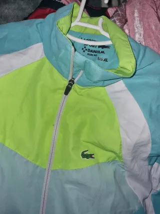 Chaqueta deportiva con un diseño moderno y llamativo. - Combinación de colores vibrantes. - Logo distintivo de la marca.