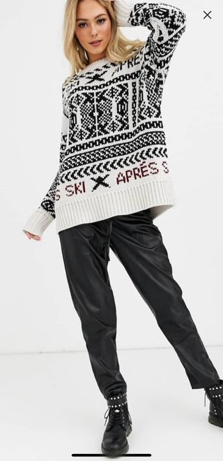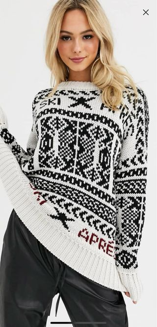 Jersey de punto con estampado de inspiración invernal y diseño oversize. - Cuello redondo. - Manga larga. - Estampado de grecas y motivos de esquí. - Detalle de texto APRÈS en el bajo.