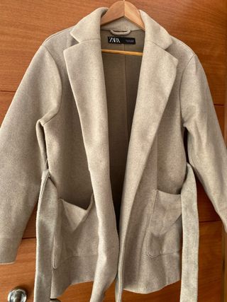 Chaqueta de punto de Zara en color beige. Es una prenda versátil y cómoda. - Diseño abierto con solapas. - Cinturón para anudar a la cintura. - Bolsillos frontales. - Tejido suave al tacto.