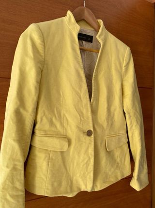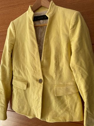 Elegante blazer de Zara en color amarillo. - Diseño con cuello mao. - Cierre de un botón. - Dos bolsillos frontales.