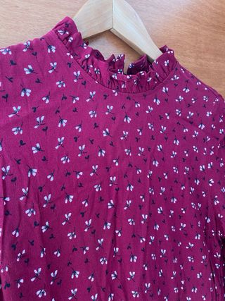 Vestido de manga tres cuartos con un bonito estampado floral. - Cuello alto con volante. - Estampado de pequeñas flores blancas y negras sobre fondo burdeos.