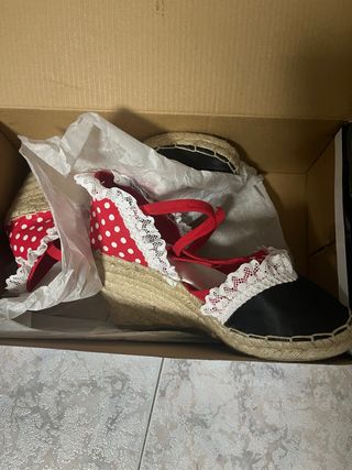 Zapatos de sevillana hechos a mano con un diseño único. - Adorno de encaje blanco. - Detalle de lunares rojos. - Punta y talón en satén negro. - Plataforma de esparto. - Son nuevos a estrenar. PRECIO ALGO NEGOCIABLE
