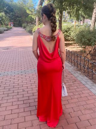 Vestido largo de fiesta en color rojo, ideal para bodas o eventos especiales. Se encuentra en buen estado. - Diseño elegante con detalles brillantes en los hombros y espalda al aire. - Corte favorecedor. Con copas incorporadas. -Mide unos 140 cm de largo desde hombros por la parte delantera y unos 5 cm adicionales por la parte trasera. -Usado con una altura de 156cm más unos tacones de 10,5cm