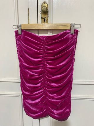 Minifalda fucsia de terciopelo de Zara, con un diseño fruncido muy favorecedor. Se encuentra en muy buen estado. - Tejido de terciopelo. - Diseño fruncido. - Largo mini.