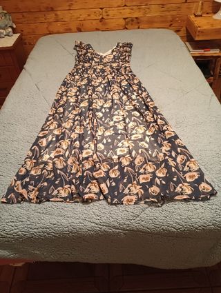 Elegante vestido largo con estampado floral. Usado una vez. Talla-40 Con forro. Con volantes en las mangas y escote. - Diseño con volantes en las mangas. - Escote en V. - Tejido ligero y vaporoso.