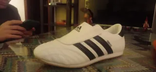 Zapatillas deportivas Adidas para taekwondo. Diseño clásico y cómodo. - Cierre sin cordones. - Tres rayas laterales. - Logo de Adidas en la lengüeta. Se venden por equivocación de talla.