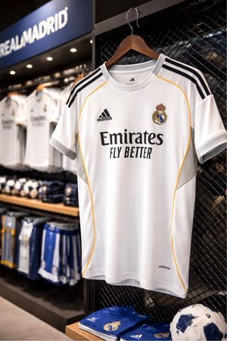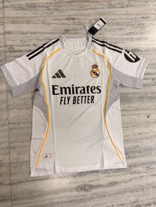 Camiseta de la primera equipación del Real Madrid para la temporada 2025/2026. - Diseño de Adidas. - Color blanco con detalles. - Escudo del club. - Logo de Emirates Fly Better.