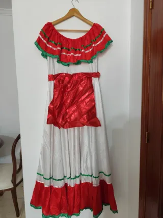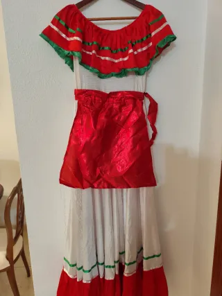 Este disfraz de inspiración mexicana es ideal para celebraciones. - Diseño con volantes en el escote. - Cinturón de tela a juego. - Detalles de cintas en rojo y verde.