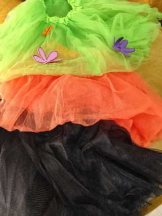 Conjunto de tres faldas de tul, perfectas para disfraces o fiestas. - Falda de tul verde con mariposas. - Falda de tul naranja. - Falda de tul negra.