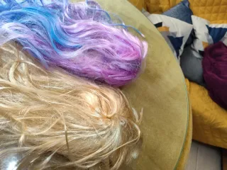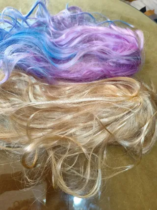 Conjunto de dos pelucas para disfraces. Perfectas para añadir un toque de color a tu atuendo. - Peluca con degradado de azul a rosa. - Peluca de color rubio. - Talla única.