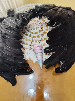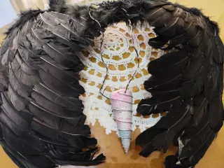 Set de alas de disfraz y un colgante con forma de cono. Las alas son negras y el colgante tiene tonos rosas y azules. - Alas de plumas negras. - Colgante con espiral metálica.