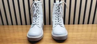 Botas de estilo militar en color beige, talla 33. Poco uso. - Cierre con cordones y cremallera lateral. - Detalle de hebilla dorada en la parte superior. - Suela gruesa y resistente.