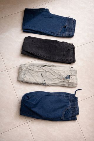 Conjunto de prendas de vestir para chica. - Pantalones beige. - Pantalones vaqueros azules. - Pantalones grises. - Pantalones rosas. - Chaqueta azul marino. - Chaqueta negra.