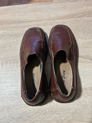 Elegantes zapatos de vestir de cuero en color marrón. - Diseño tipo mocasín. - Costuras decorativas. - Suela de goma.