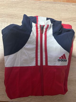 Chaqueta deportiva con un diseño moderno y llamativo. - Paneles de color azul marino, blanco y rojo. - Logo de Adidas en el pecho. - Señales de uso por el tiempo. - Gomas desgastadas para cambiar