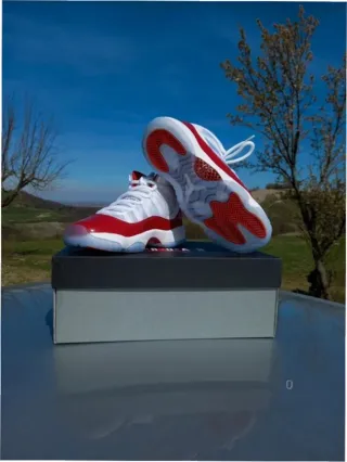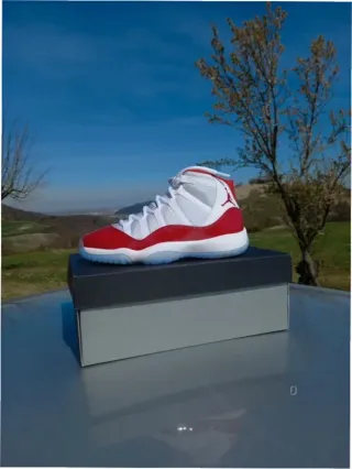 Zapatillas Jordan 11 Retro Cherry. - Diseño icónico con detalles en rojo y blanco. - Suela translúcida característica. - Cordones blancos.