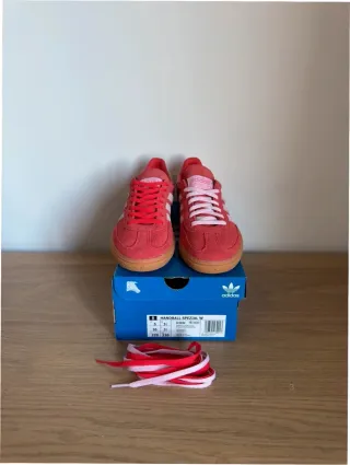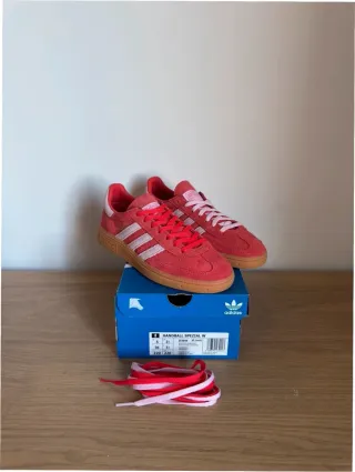 Zapatillas Adidas Handball Spezial en color rojo brillante con detalles en rosa. - Parte superior de ante. - Suela de goma. - Cordones adicionales incluidos.
