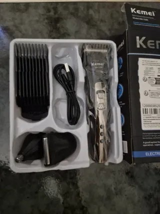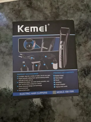 Maquina de pelar o cortapelos eléctrico Kemei, modelo KM-1506. - Cabezal de barbero. - Cabezal de nariz. - Cepillo. - Lecythus. - Adaptador de corriente. - Peine de límite de corte. Barba, afeitar, pelo, cortar