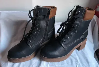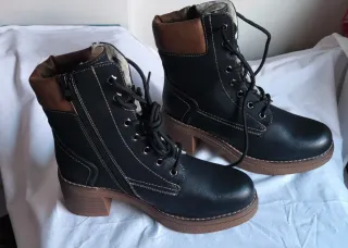 Botines negros con detalles en marrón y suela de goma. - Cierre de cordones. - Cremallera lateral. - Cuello acolchado. - Costuras decorativas.