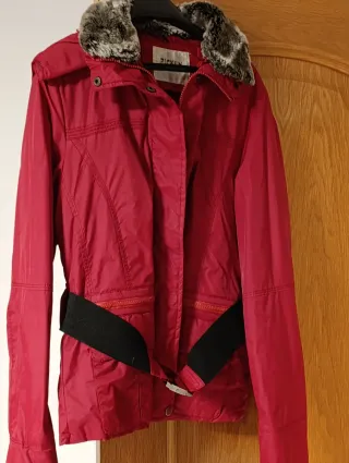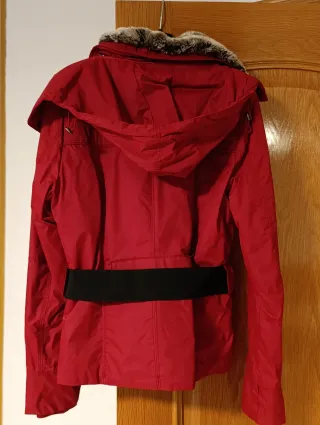 Parka de color rojo con detalles modernos. Cuenta con un cinturón negro que ajusta la cintura y un cuello con pelo sintético. - Cremallera frontal. - Bolsillos con cremallera. - Cinturón negro con hebilla metálica.