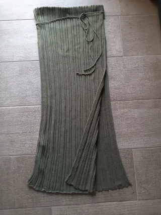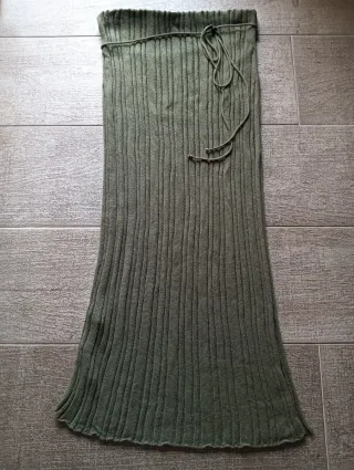 Falda midi de punto color verde caqui con un diseño acanalado y abertura lateral.Tejido elástico y cómodo. Cintura con detalle de cordón ajustable. Bajo con acabado festoneado.