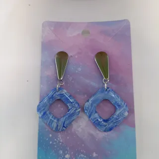 Pendientes hechos a mano con un diseño moderno y llamativo. De arcilla polimerica y acero inoxidable. - Diseño en forma de rombo. - Acabado marmoleado en tonos azules y blancos. - Cierre de acero inoxidable plateado.