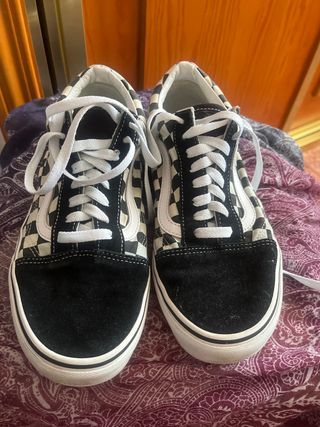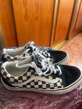 Zapatillas Vans Old Skool con el clásico diseño checkerboard. - Puestas solo dos veces, como nuevas. - Combinación de colores blanco y negro. - Cierre con cordones.