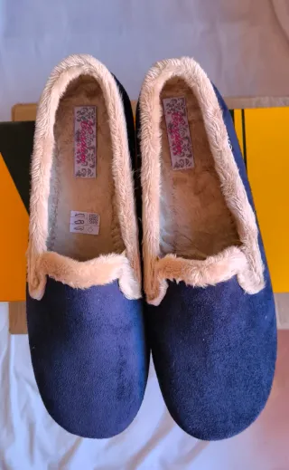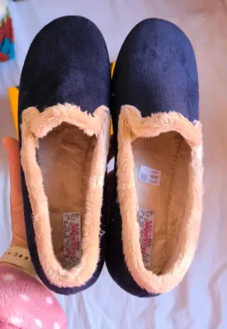 Comodísimas zapatillas de casa para estar a gusto en casa. - Exterior azul. - Forro interior beige. - Detalle de pelo en el borde.