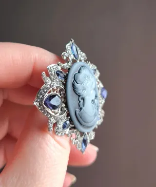 Elegante broche con un diseño de camafeo y detalles en pedrería. - Diseño de camafeo con perfil de mujer. - Adornado con piedras de color azul intenso. - Marco metálico plateado con incrustaciones.