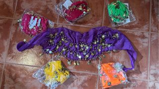 Pañuelo o cinturón de gasa adornado con monedas, ideal para danza del vientre. - Diseño con múltiples monedas doradas. - Tejido ligero y vaporoso. 6 pañuelos: rojo, rosa, naranja, amarillo, verde y morado Los 6 pañuelos: 25€ Cada unidad: 6€