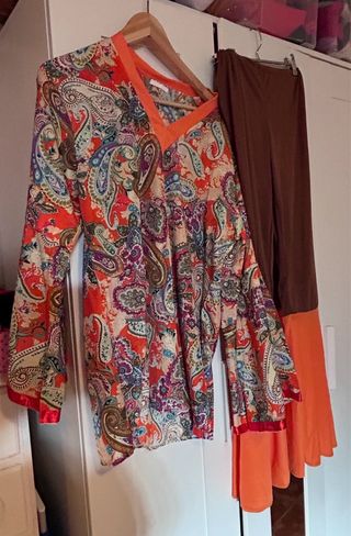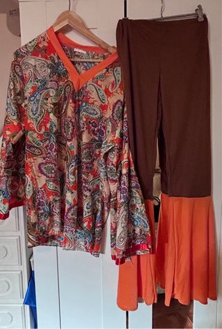Conjunto de disfraz estilo hippie para mujer. - Diseño con estampado paisley vibrante. - Detalles en color naranja. - Manga larga. - Gafas a juego