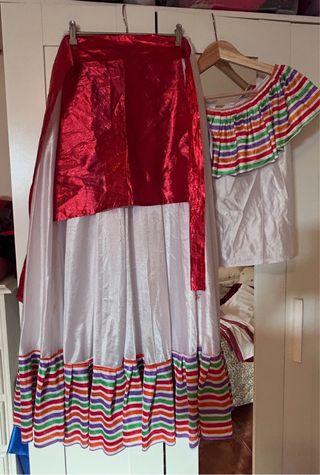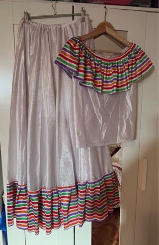 Conjunto de disfraz tradicional mexicano. - Falda larga con volantes y detalles de rayas. - Parte superior con escote Bardot y rayas de colores. - Tejido brillante y ligero.