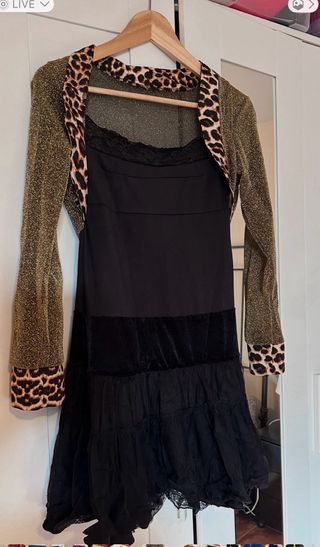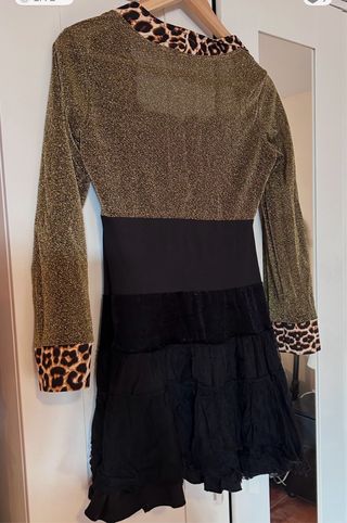 Este disfraz ochentero para mujer es una pieza llamativa y original. - Diseño con estampado de leopardo en cuello y puños. - Cuerpo superior brillante en tono dorado. - Cintura marcada en negro. - Falda en capas con textura. - Tejido elástico - Talla L - Largo:80, ancho cintura 34 cm
