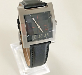 Reloj Dunhill DM7 Facet 8030 con cronógrafo y alarma. - Caja cuadrada de acero inoxidable. - Correa de cuero negra. - Esfera negra con detalles en rojo. - Indicador digital en la parte inferior.