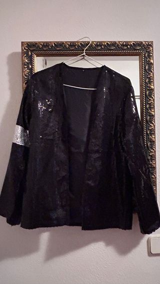 Chaqueta inspirada en Michael Jackson, cubierta de lentejuelas brillantes. - Diseño tipo chaqueta. - Detalle de banda plateada en la manga. Dimensiones: Largo:64cm, ancho:53 cm Regalo de guante lentejuelas blanco